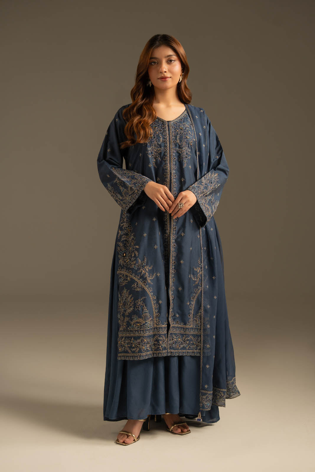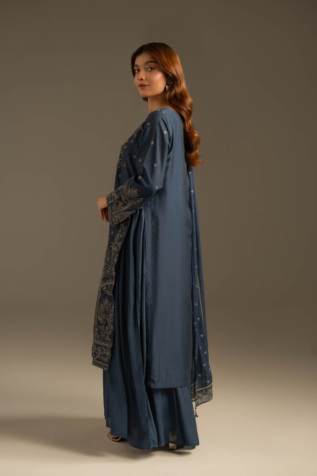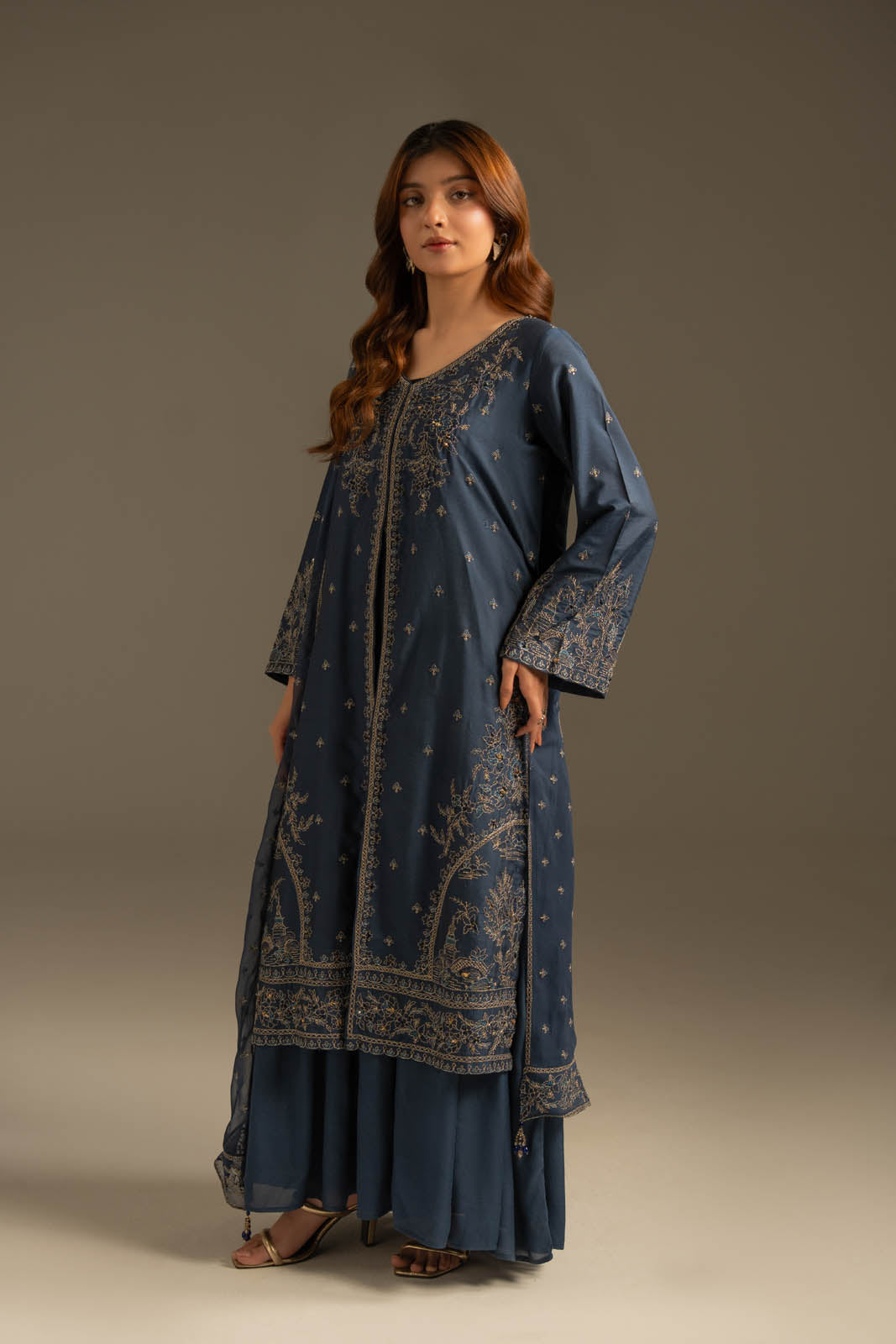 Article Name: MIDNIGHT BLUE Z Color: Blue Fabric: Cotton Silk Pieces: 2 Piece Shirt/Dupatta Classic blue dress exuding sophistication and timeless style ideal for both formal and semi formal occasion.