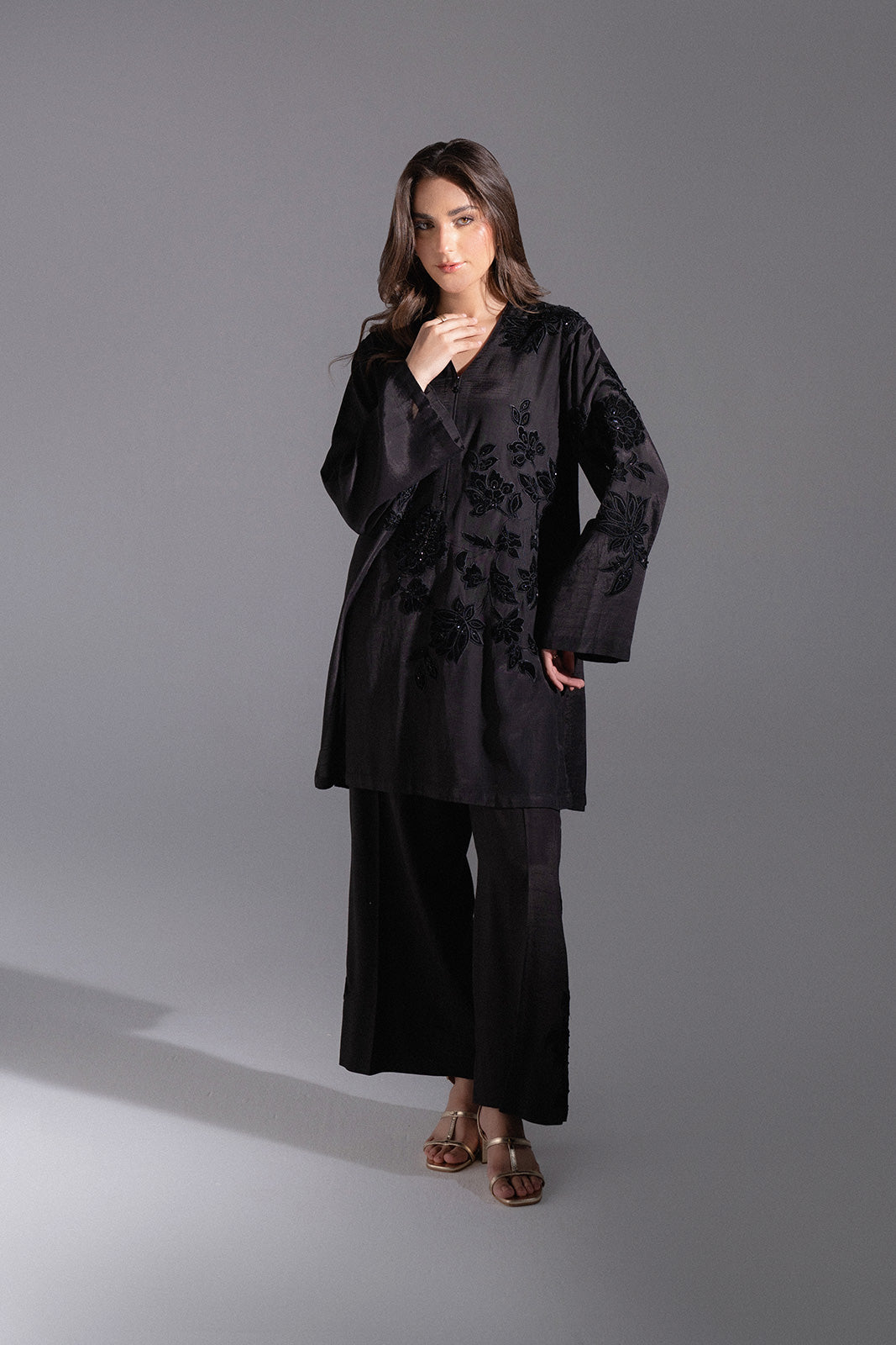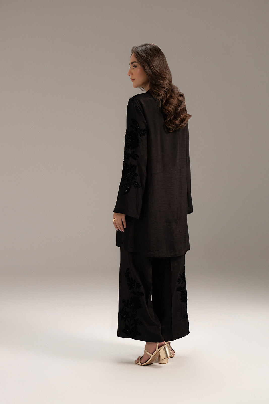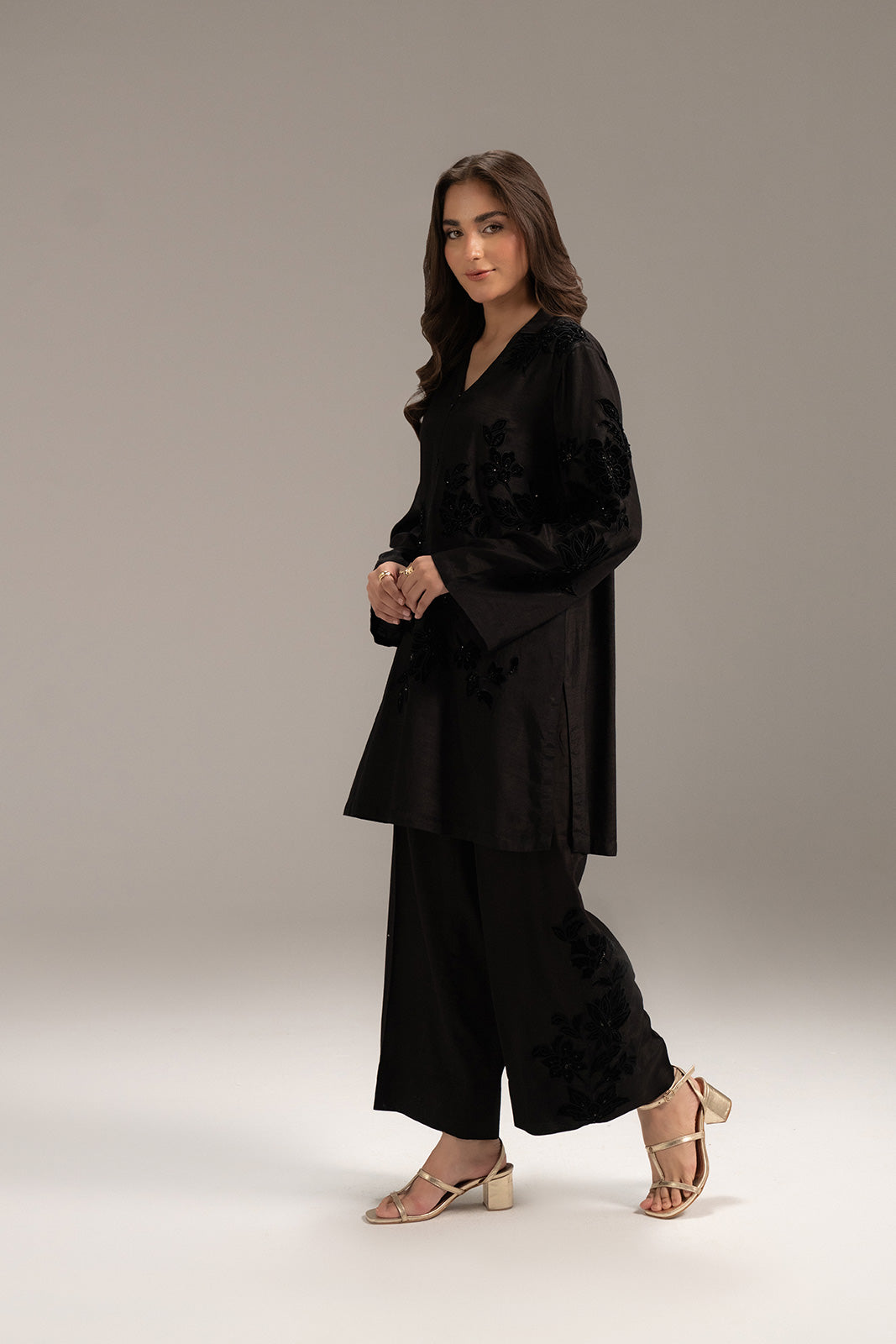 Article Name: TRENDY BLACK B Color: Black Fabric: Raw Silk Pieces: 2 Piece Shirt/Bottom A chic black raw silk article adorned with rich velvet applique, offering a trendy & Rashia formal look perfect for your winter gathering.