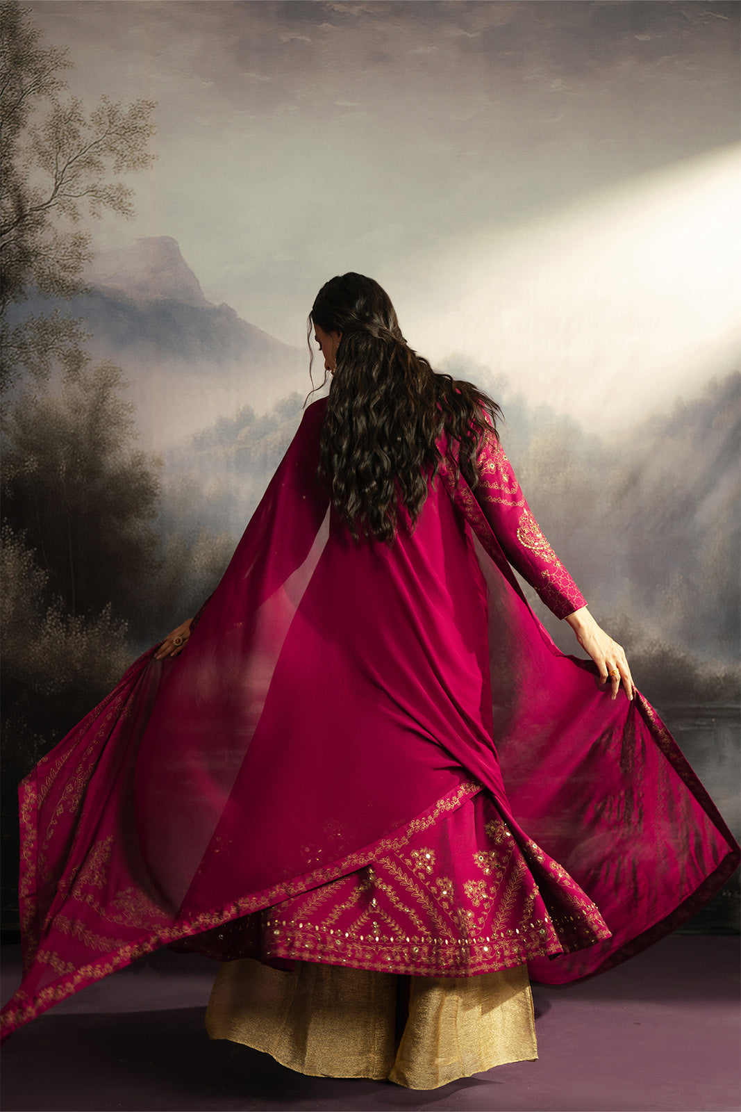Article Name: C S MAROON F Color: Pink Fabric: Cotton Silk Pieces: 2 Piece Shirt/Dupatta Pink silk kalidar with our handcrafted gold print embellished with mirror, gotta, sequins and crystal paired up with gold printed dupatta.