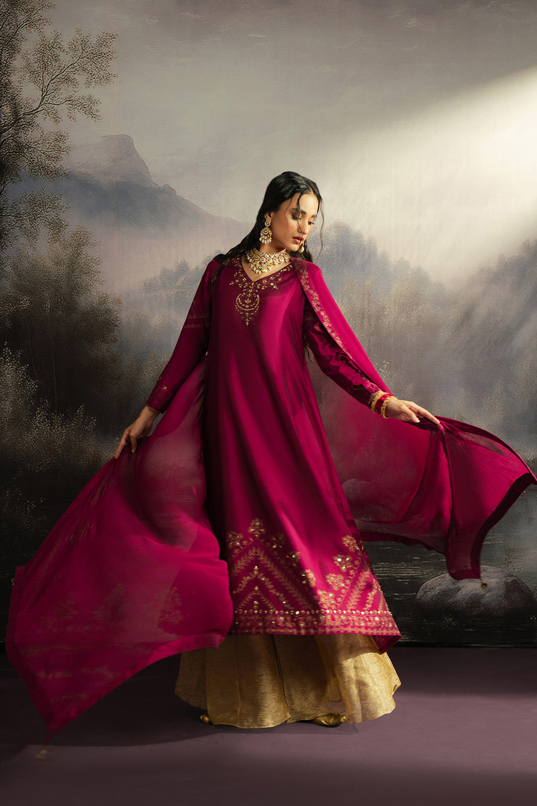 DetailsArticle Name: C S MAROON FColor: PinkFabric: Cotton SilkPieces: 2 Piece Shirt/DupattaPink silk kalidar with our handcrafted gold print embellished with mirror, gotta, sequins and crystal paired up with gold printed dupatta.