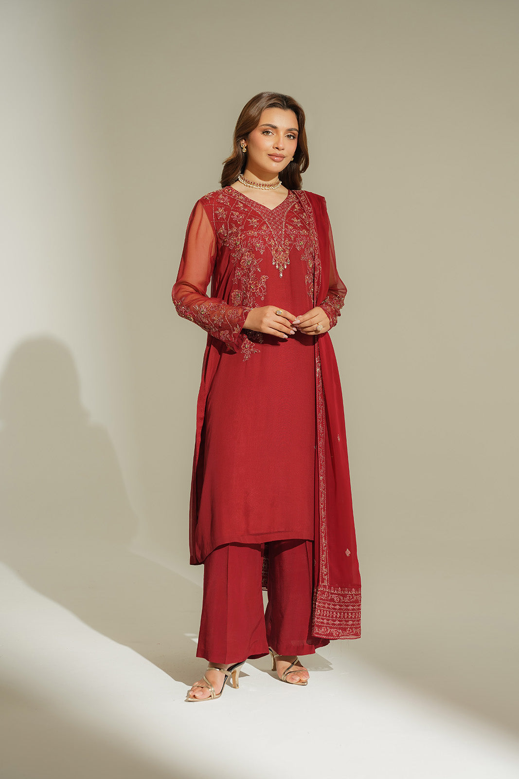 Article Name: RUBY CHECK Color: Red Fabric: Chiffon Pieces: 3 Piece Suit Three-piece suit elegant designed for any occasion with beautiful details on yoke.