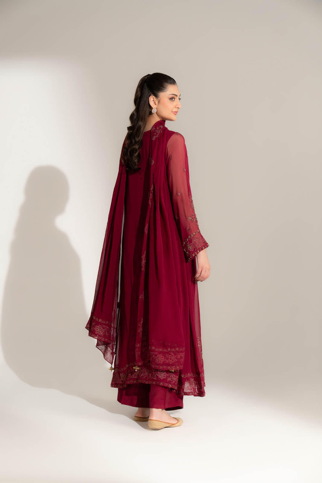 Article Name: PLUM SColor: PlumFabric: ChiffonPieces: 3 Piece SuitPlum chiffon kalidar dress with detailed embroidery & crystals and hand embellished on neckline & sleeves paired up with embroidered dupatta & silk culottes.