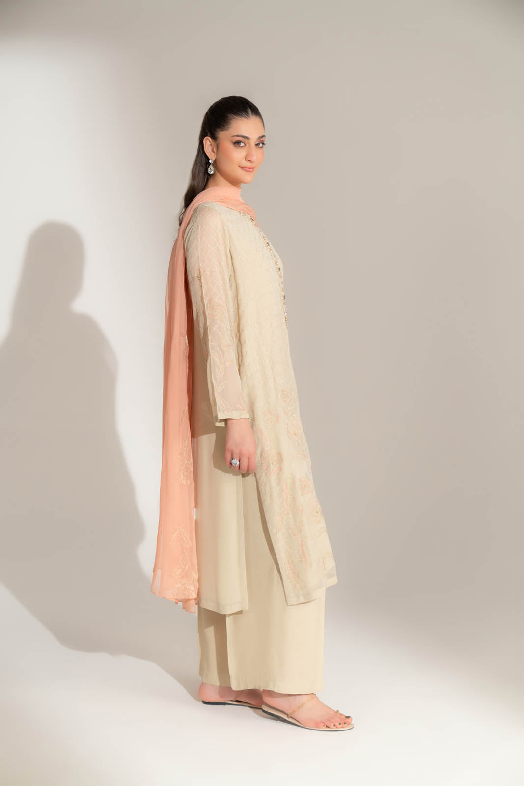Article Name: PEACHY MELBAColor: IvoryFabric: ChiffonPieces: 3 Piece SuitOur full embroidered chiffon shirt with hand crafted embellishment paired up with pastel peach embroidered dupatta & ivory silk culottes.