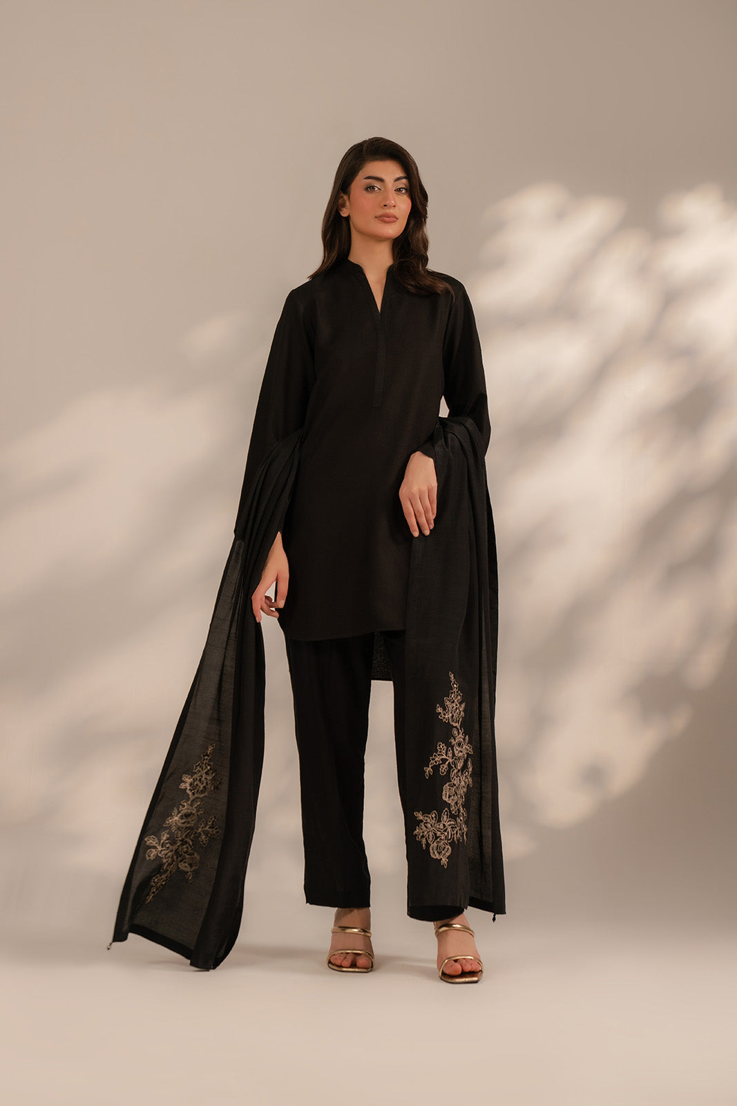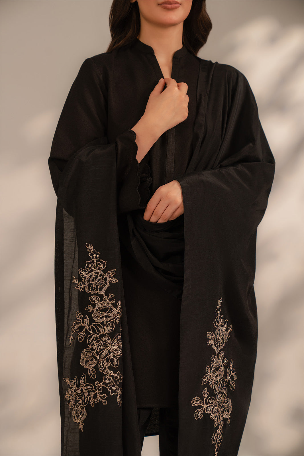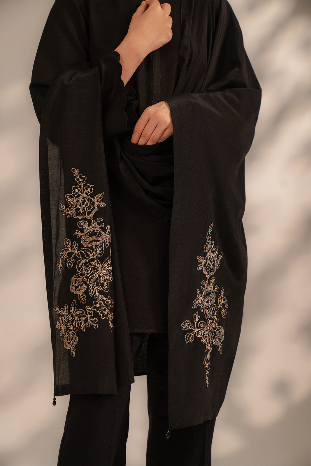 Article Name: BLACK BLOSSOM S Color: Black Fabric: Raw Silk Pieces: 1 Piece Stole Timeless black stole crafted for effortless elegance soft and light weight perfect for adding a touch of sophistication to any outfit.
