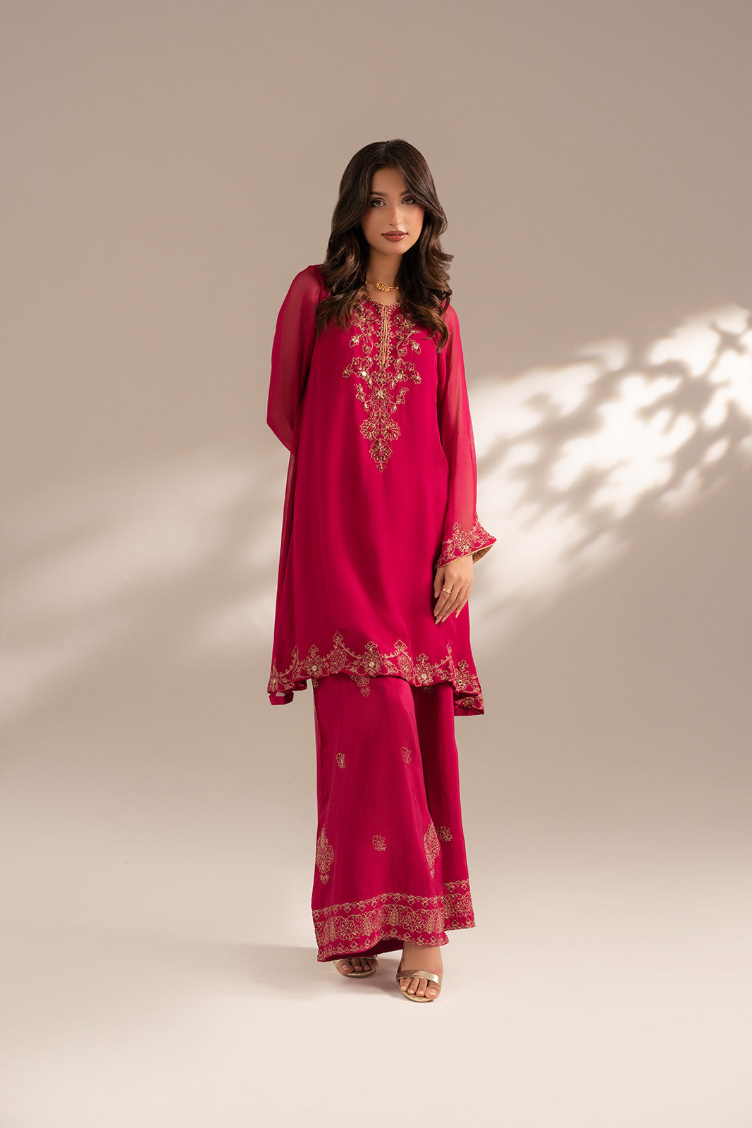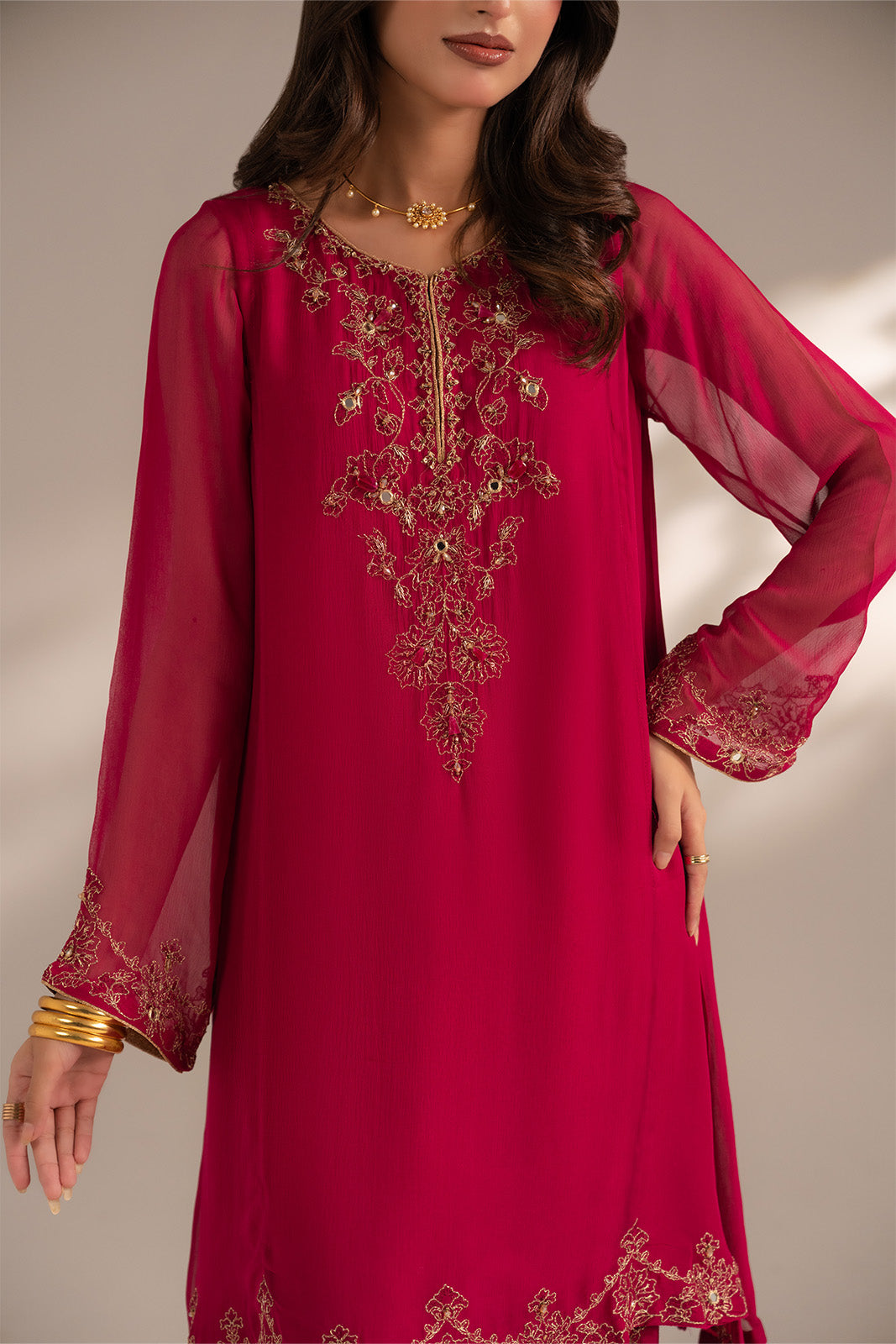 Article Name: GULABI S Color: Pink Fabric: Chiffon Pieces: 2 Piece Shirt/Bottom Featuring a festive shirt paired with an Embroidered shalwar, perfect for making a statement at any occasion.