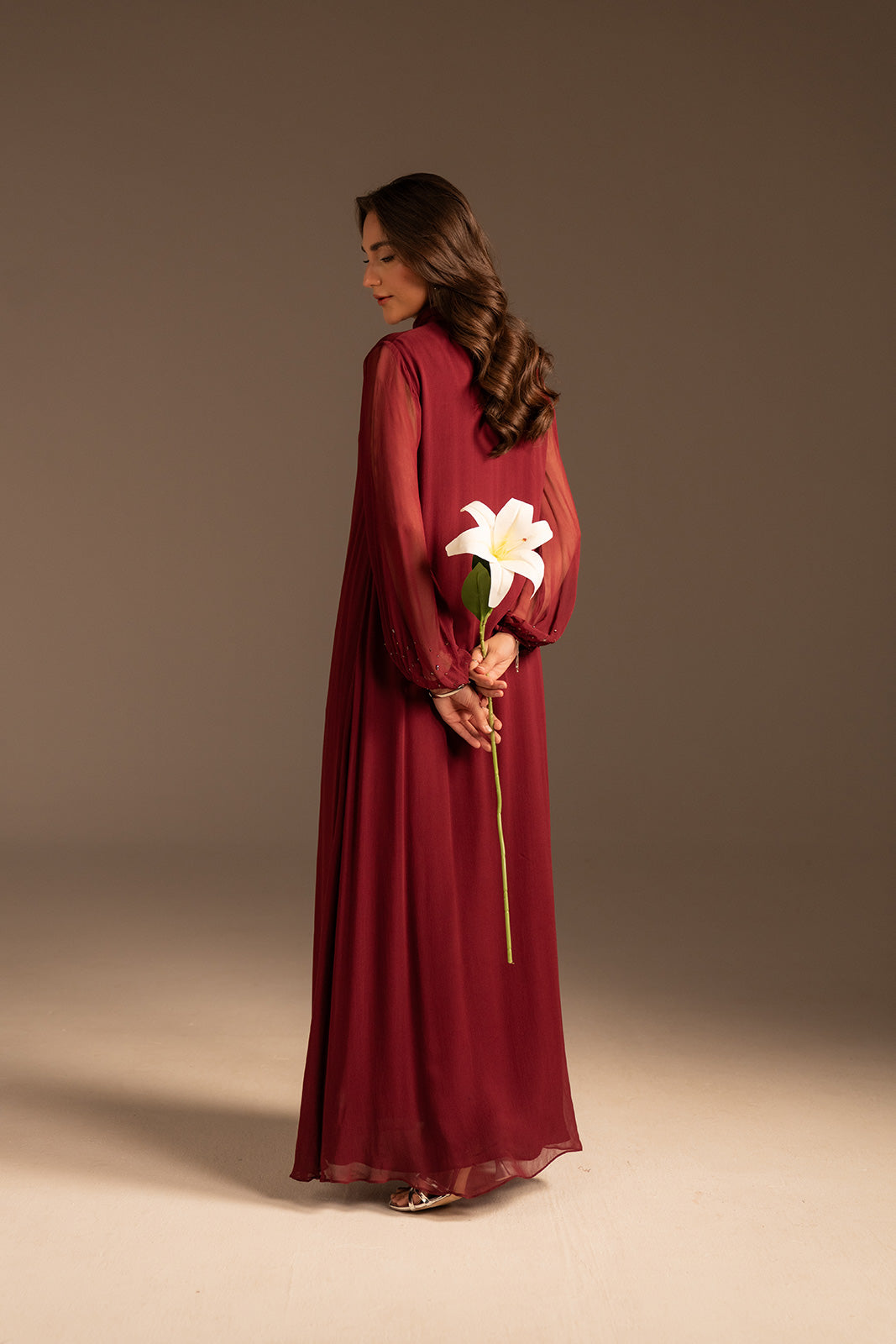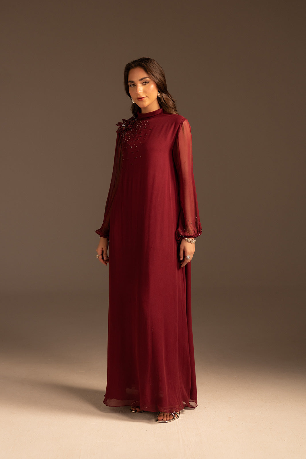 DetailsArticle Name: MODA FLAREColor: MaroonFabric: ChiffonPieces: 1 Piece ShirtAdorned with three dimensional floral hand embellishment, this flowing dress creates a regal look perfect for any occasion.