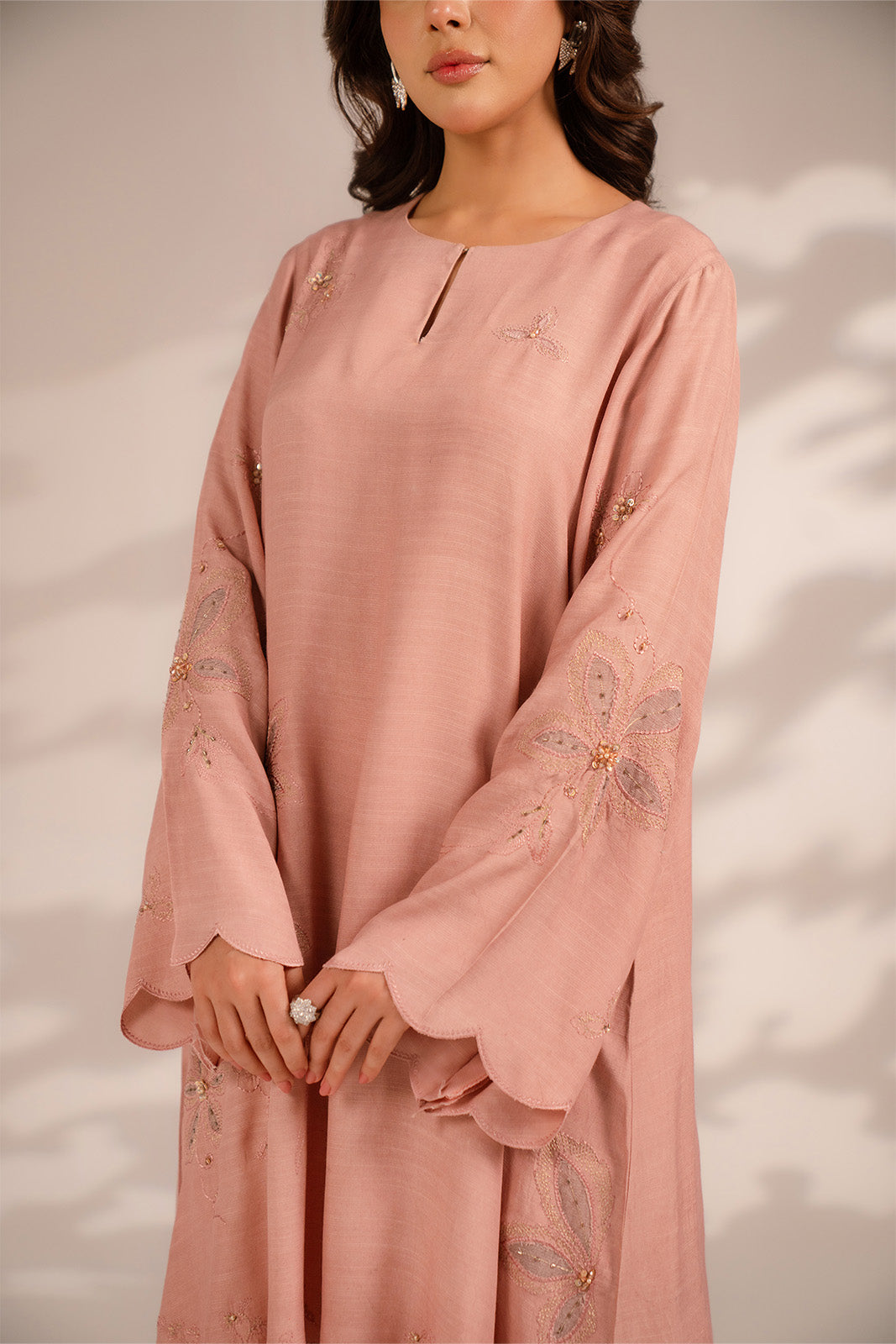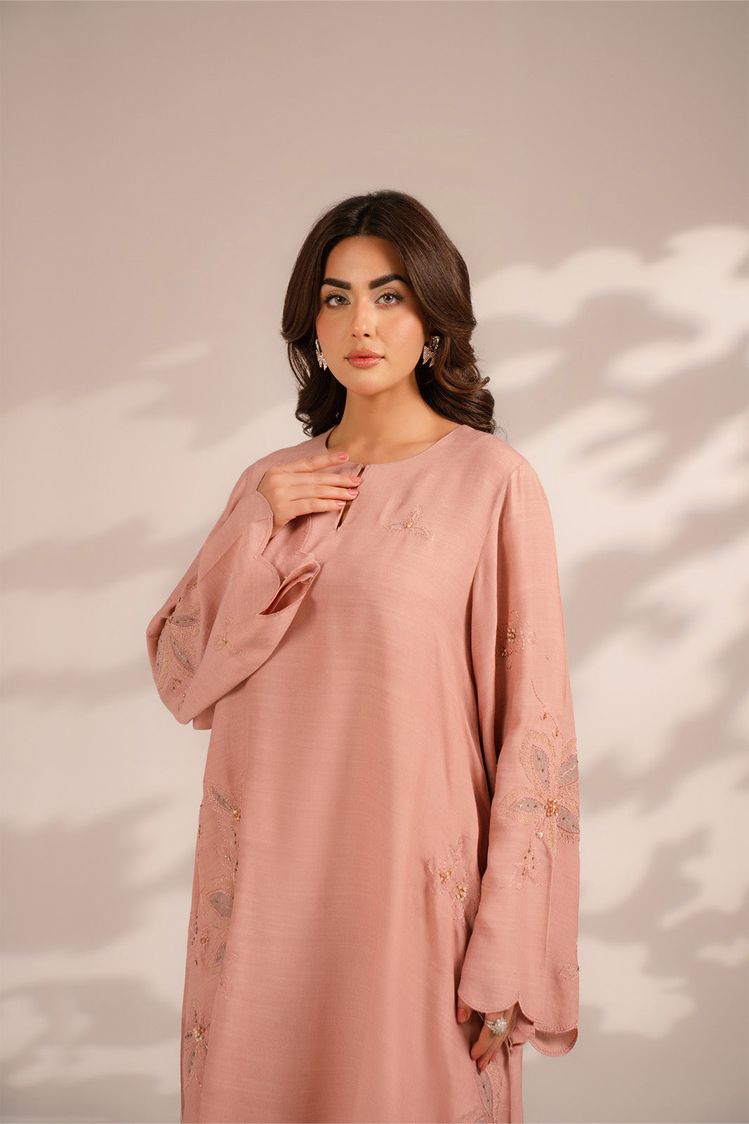 Article Name: PARISA AP Color: Tea Pink Fabric: Raw Silk Pieces: 2 Piece Shirt/Bottom With this modern applique detail with added bling to elevate your glamour on any occasion.
