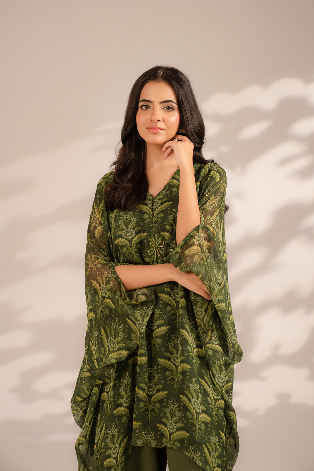 Article Name: GO GREEN Color: Green Fabric: Chiffon Pieces: 2 Piece Shirt/Bottom Chic printed green kaftan style dress, design for effortless elegance and comfort with a flowing silhouette and modern appeal.