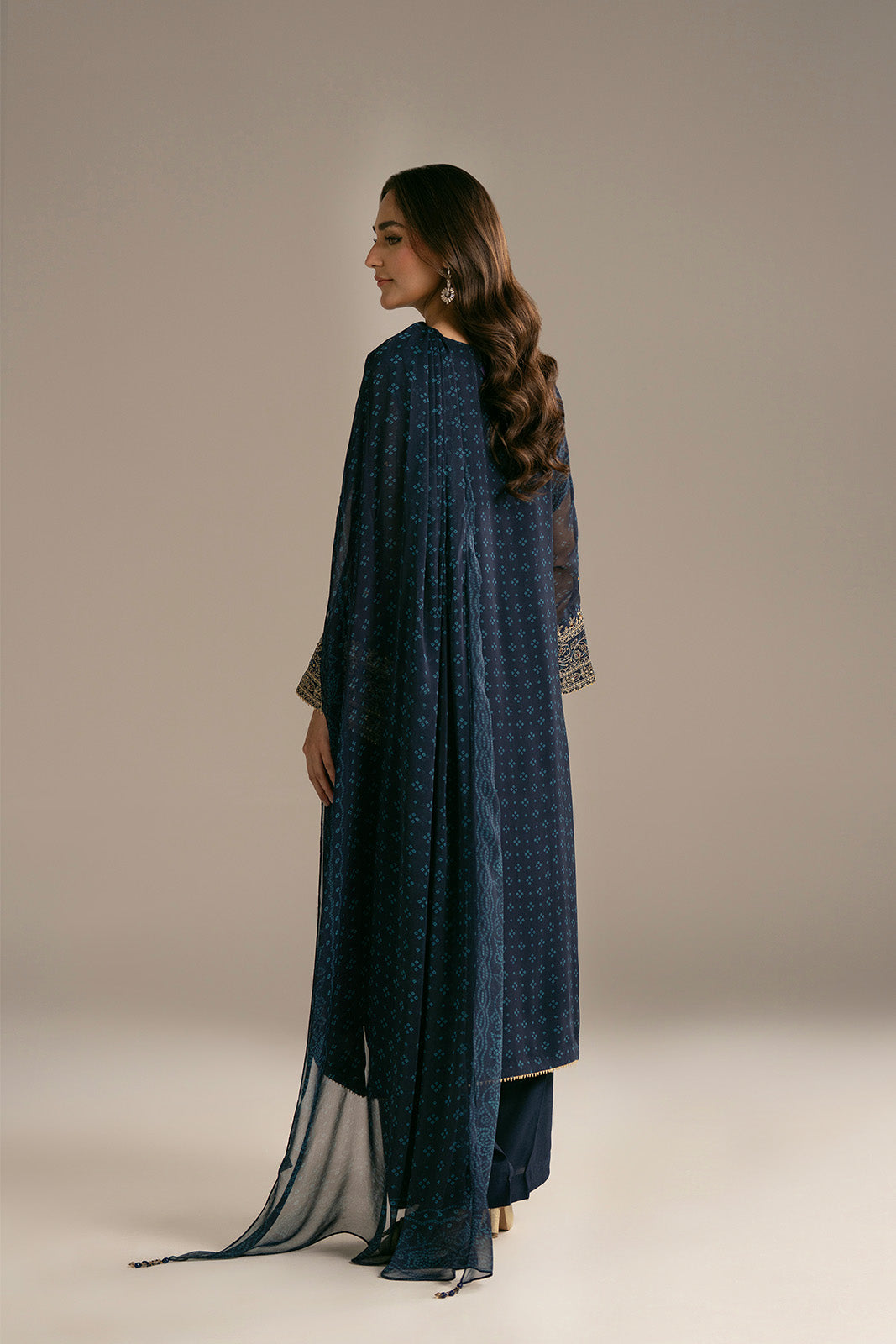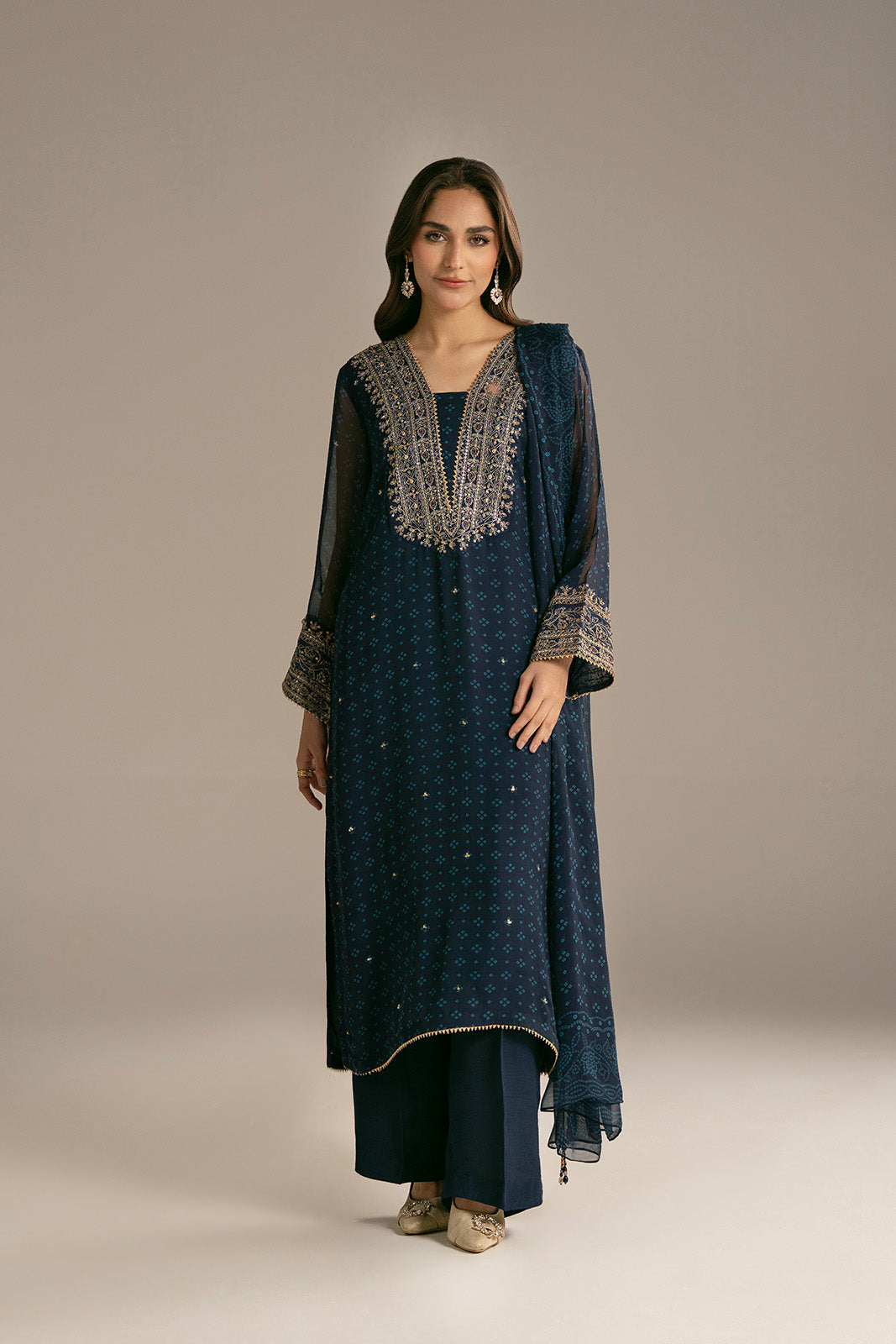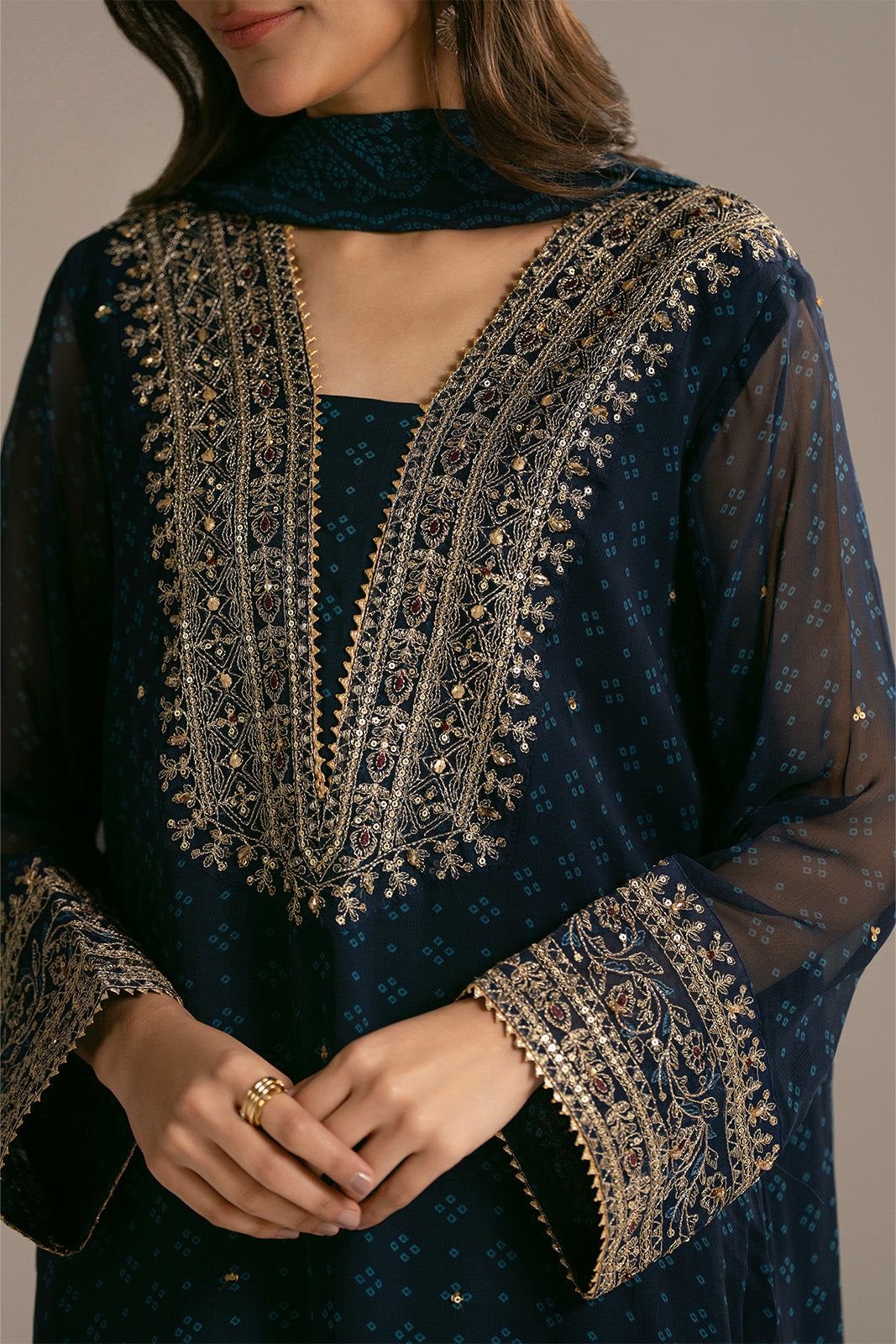Article Name: CHUNRI GLAM Color: Navy Blue Fabric: Chiffon Pieces: 3 Piece Suit A vibrant chunri print adorned with traditional sequins creating the perfect blend of culture and glamour.