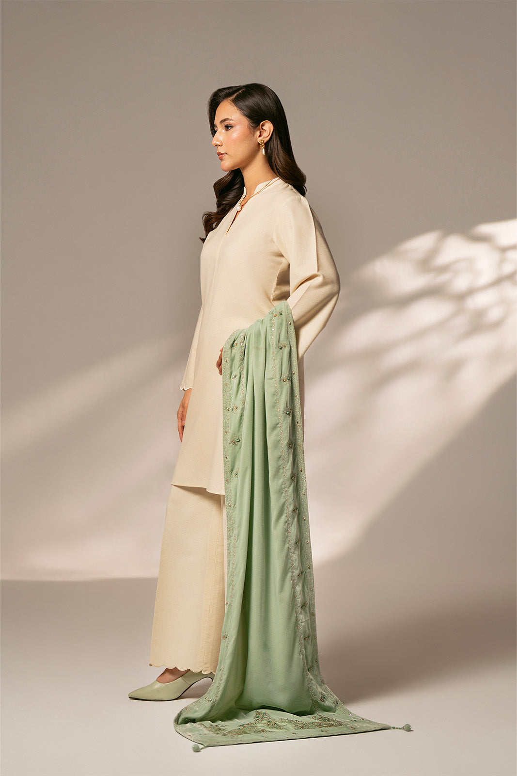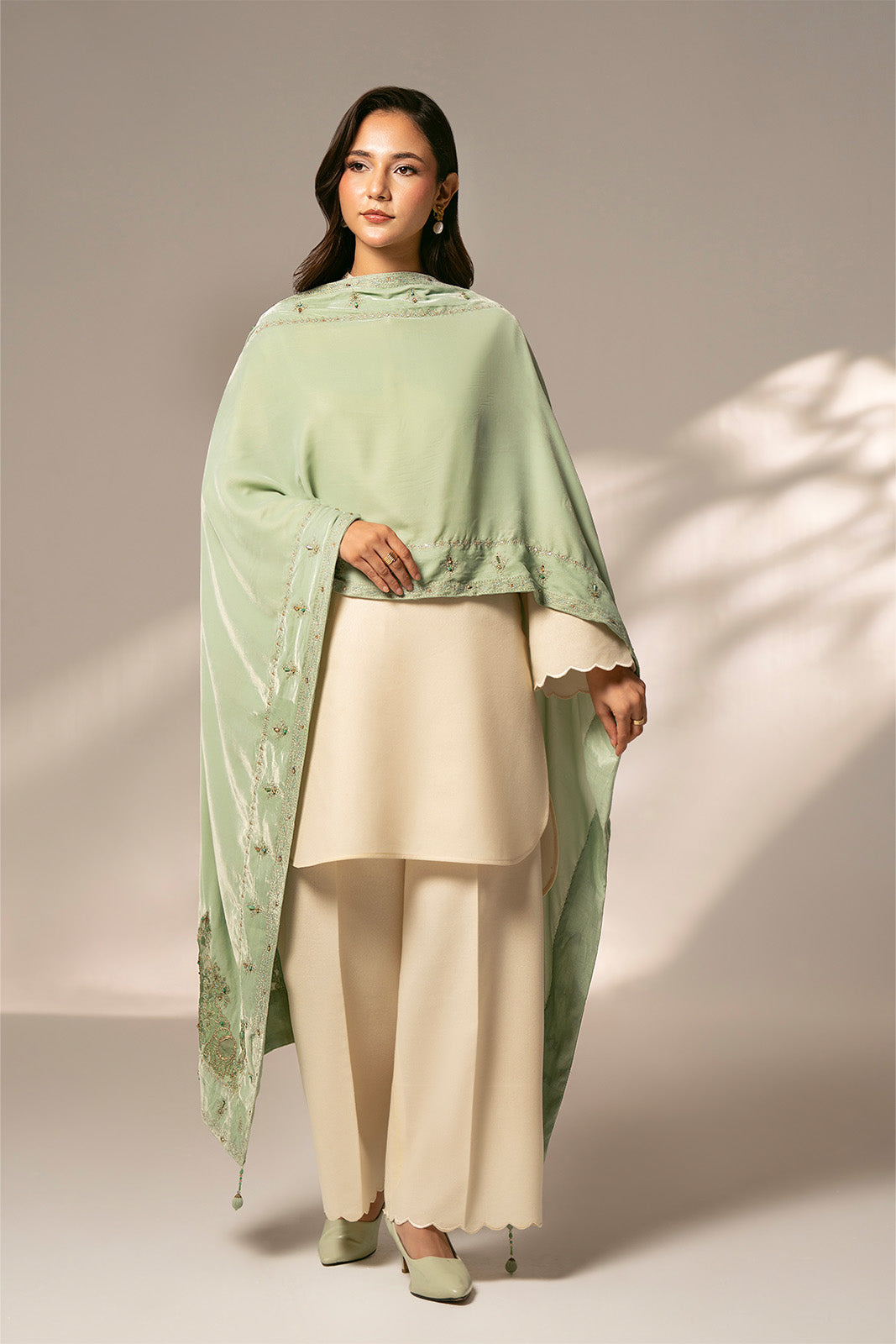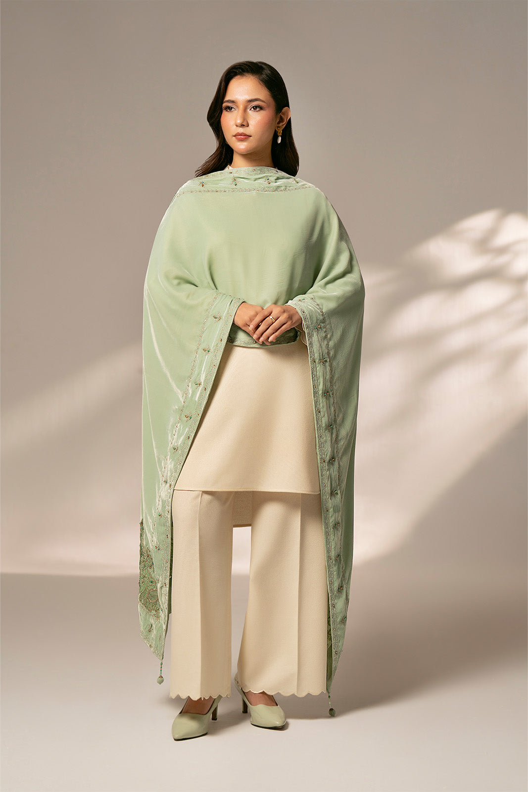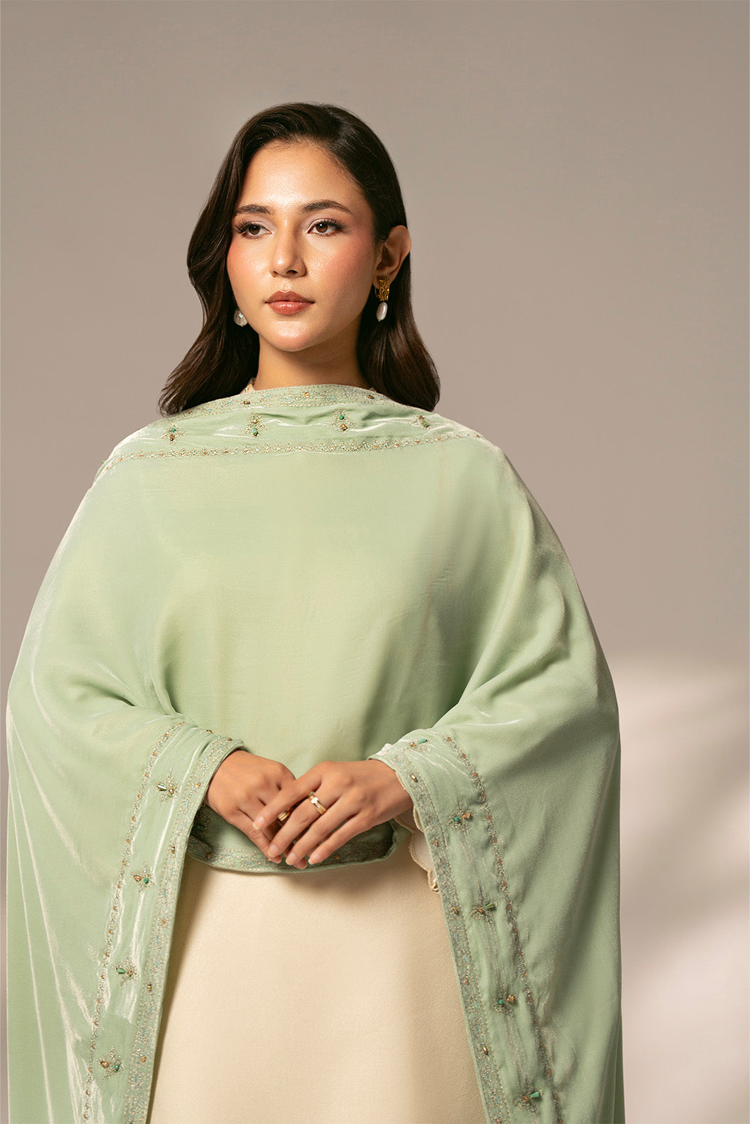 Article Name: BLUSH MINT Color: Light Green Fabric: Velvet Pieces: 1 Piece Stole Ever light green velvet stole with organza patch and hand work details.