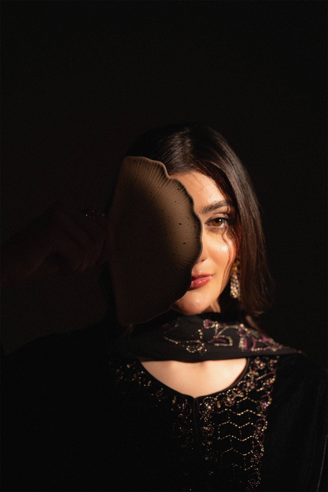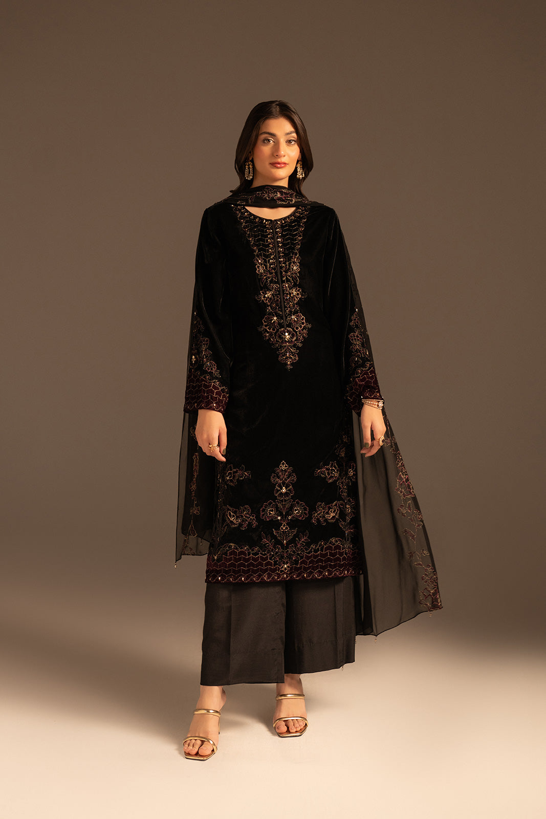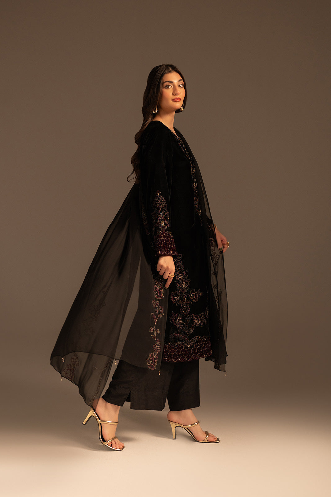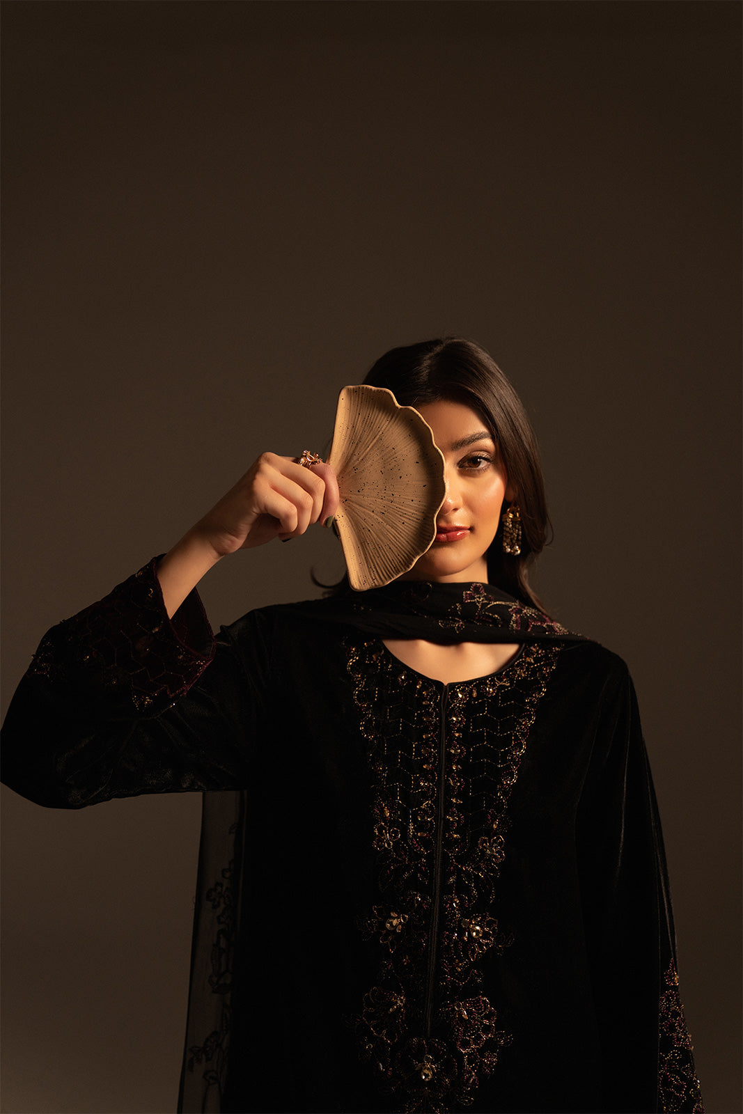 Rich velvet outfit applique done on hem & sleeves hand embellished with crystals zardozi and intricate mirror work paired up with embroidered chiffon dupatta & silk culottes.