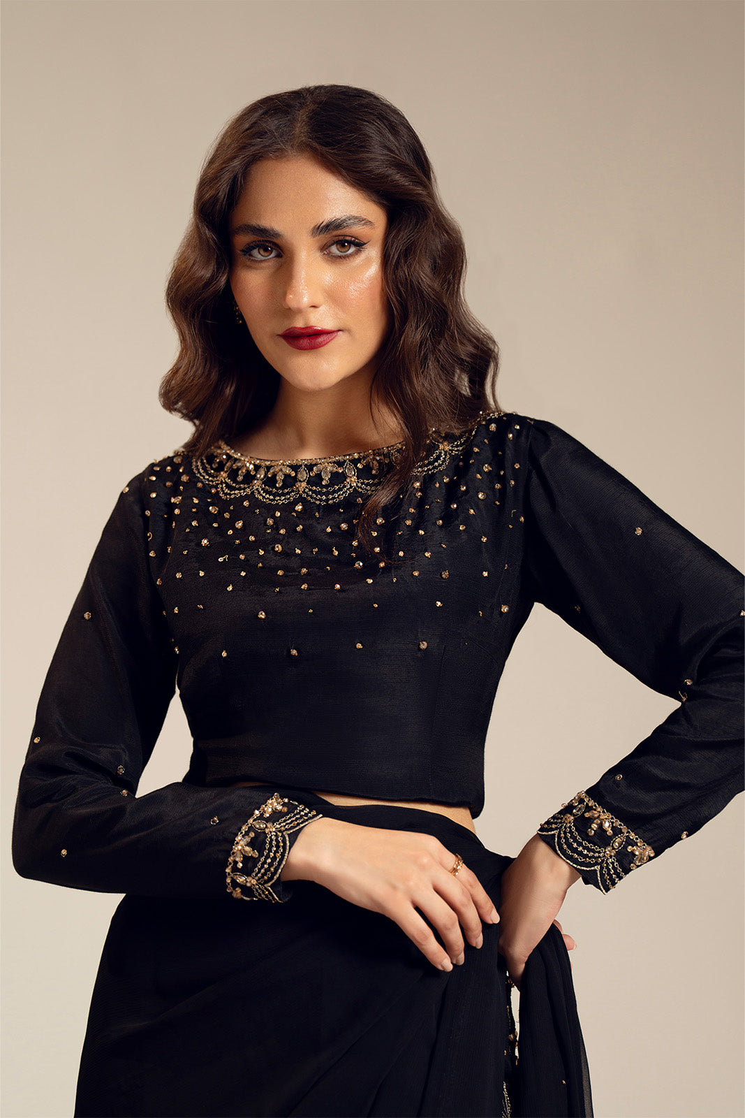Article Name: BLACK SPARK B Color: Black Fabric: Chiffon Pieces: 3 Piece Suit Saree with detailed fine hand-crafted embellishment & designed pallu, perfect blend of tradition & contemporary flair makes you standout at gathering.