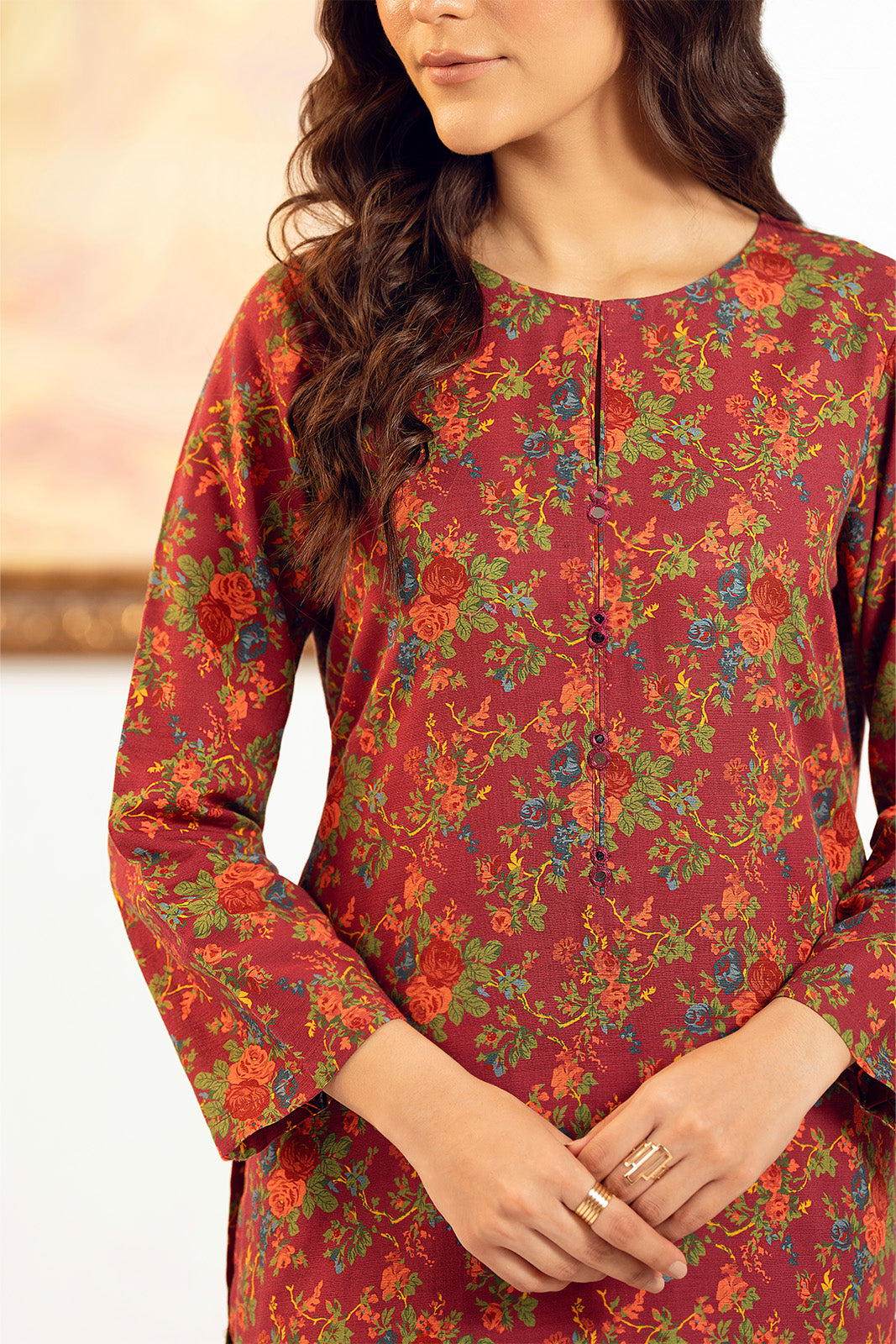 Article Name: BURGANDY BUNCH U Color: Plum Fabric: Slub Khaddar Pieces: 2 Piece Shirt/Bottom Make a statement with our two piece floral printed suit featuring a khaddar printed shirt paired with matching trouser.