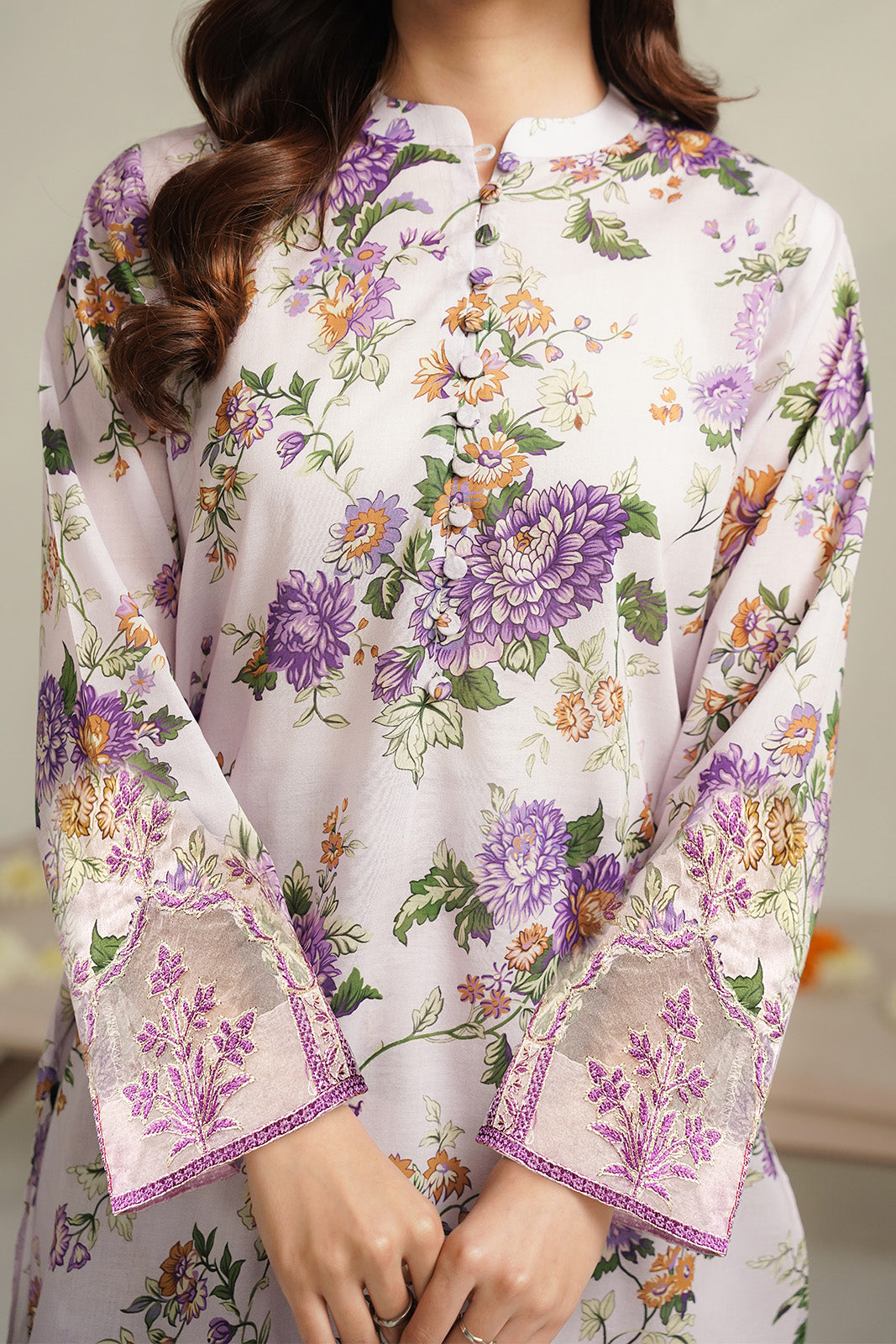 Article Name: BAHARIA U Color: Lilac Fabric: Printed Lawn Pieces: 2 Piece Shirt/Bottom Printed shirt and trouser piece along with embroidered patches on organza.