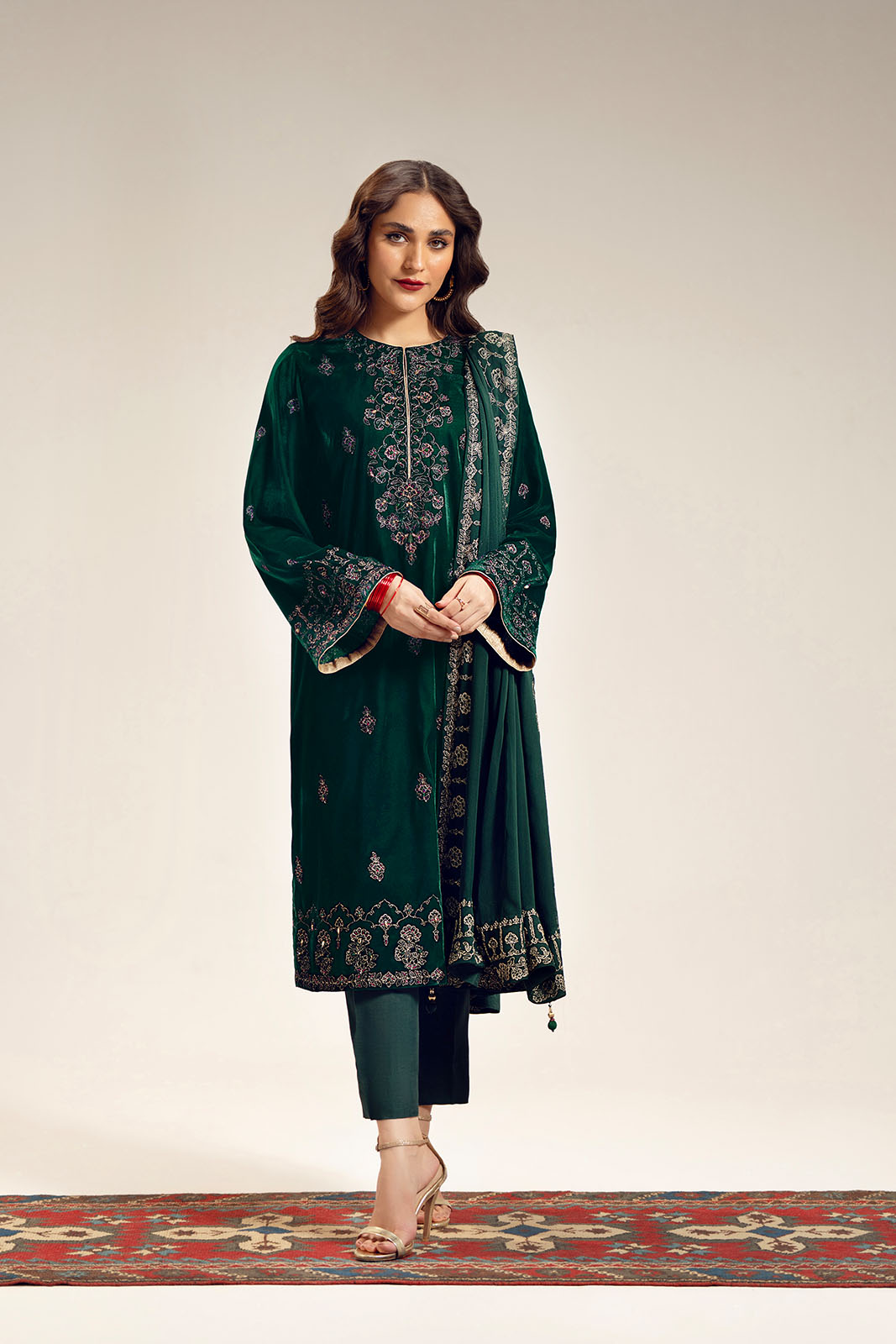 Article Name: ELEGANT U Color: Emerald Green Fabric: Velvet Pieces: 3 Piece Suit Rich velvet shirt with detailed tilla & thread embroidery, hand embellished with zardozi & crystal paired up with embroidered chiffon dupatta and silk trouser.